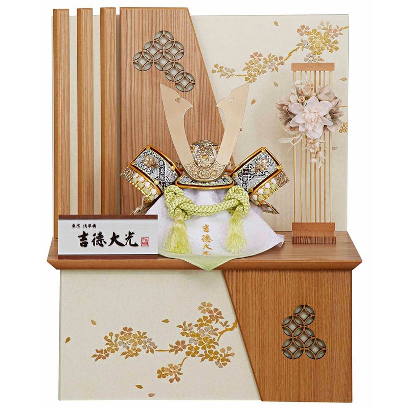 兜の吹返しには桜の金具を用い華やかな雰囲気の添えるアレンジフラワーを配されています。
